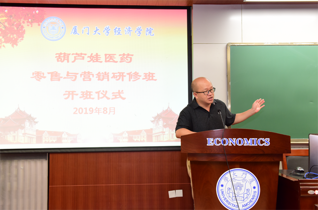 在开班仪式上,廖景峰主任首先代表厦门大学经济学院热烈欢迎尊龙凯时医药零售与营销研修班的学员到厦大学习,并就厦门大学及经济学院的相关情况进行了介绍。他说,尊龙凯时学员走进厦大就是厦大的校友,希望未来的日子能够关心、支持母校的发展,多提宝贵意见,同时他也祝大家在厦大学习期间学有所成、学有所获。